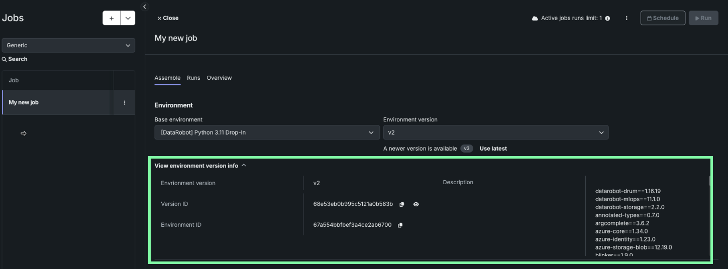 カスタムジョブの現在の環境バージョンについて詳細情報を確認するには、環境バージョンの情報を表示をクリックし、環境バージョン、バージョンID、環境ID、説明を表示できます。