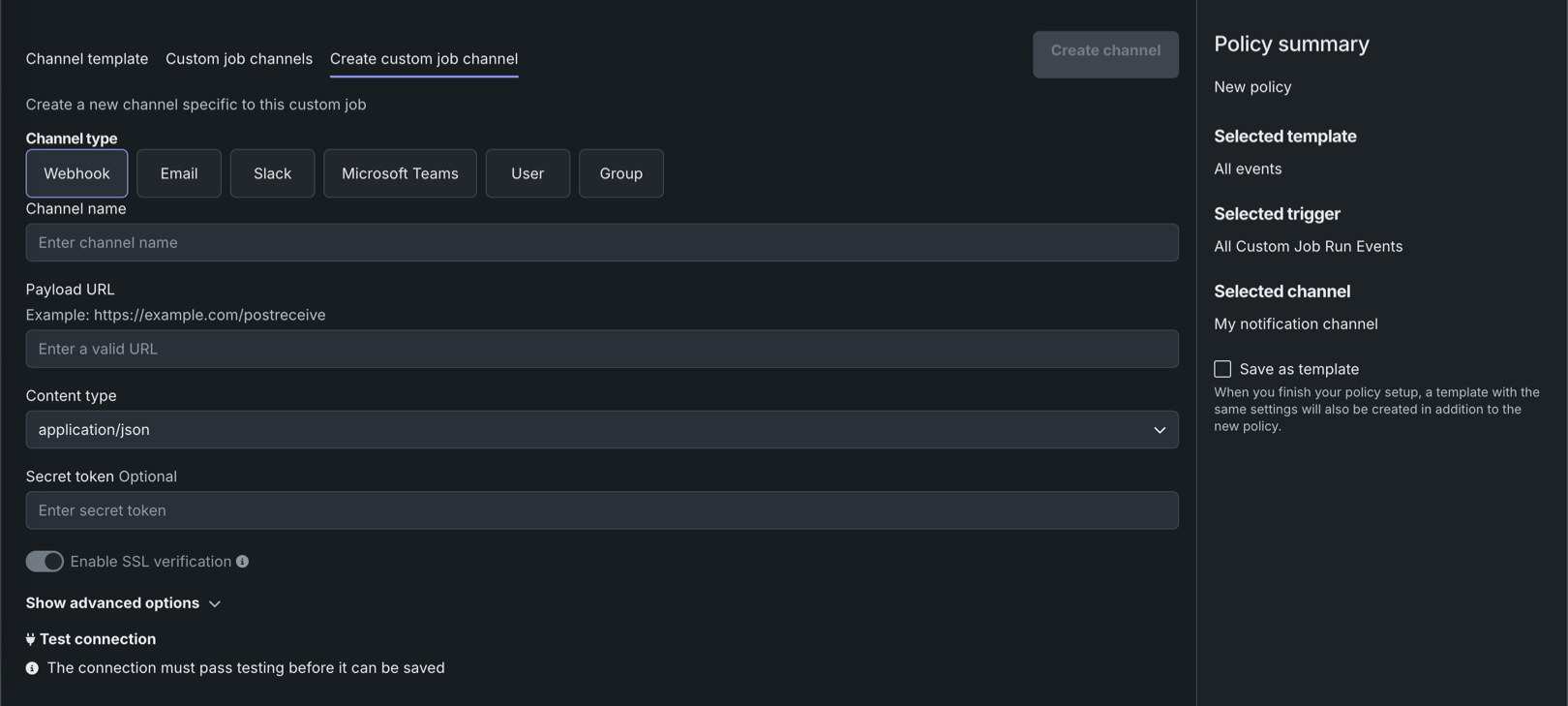 Alternatively, if you haven't configured an appropriate channel, click Create custom job channel, configure the following channel settings, and then click Create channel to add and select a new custom channel: