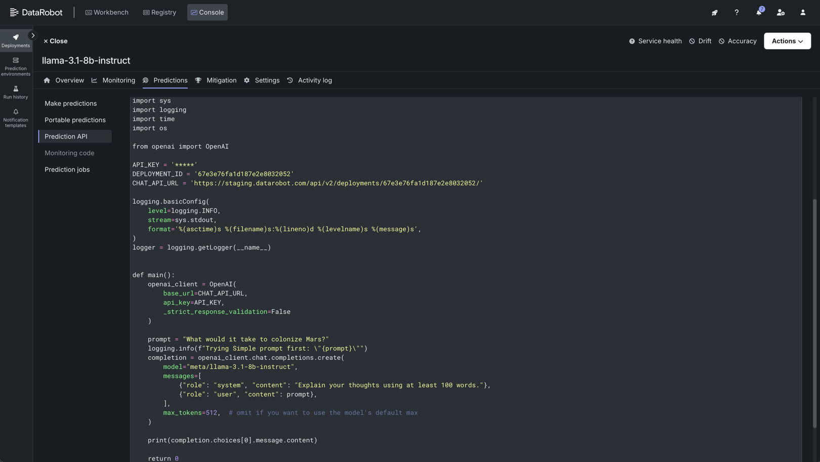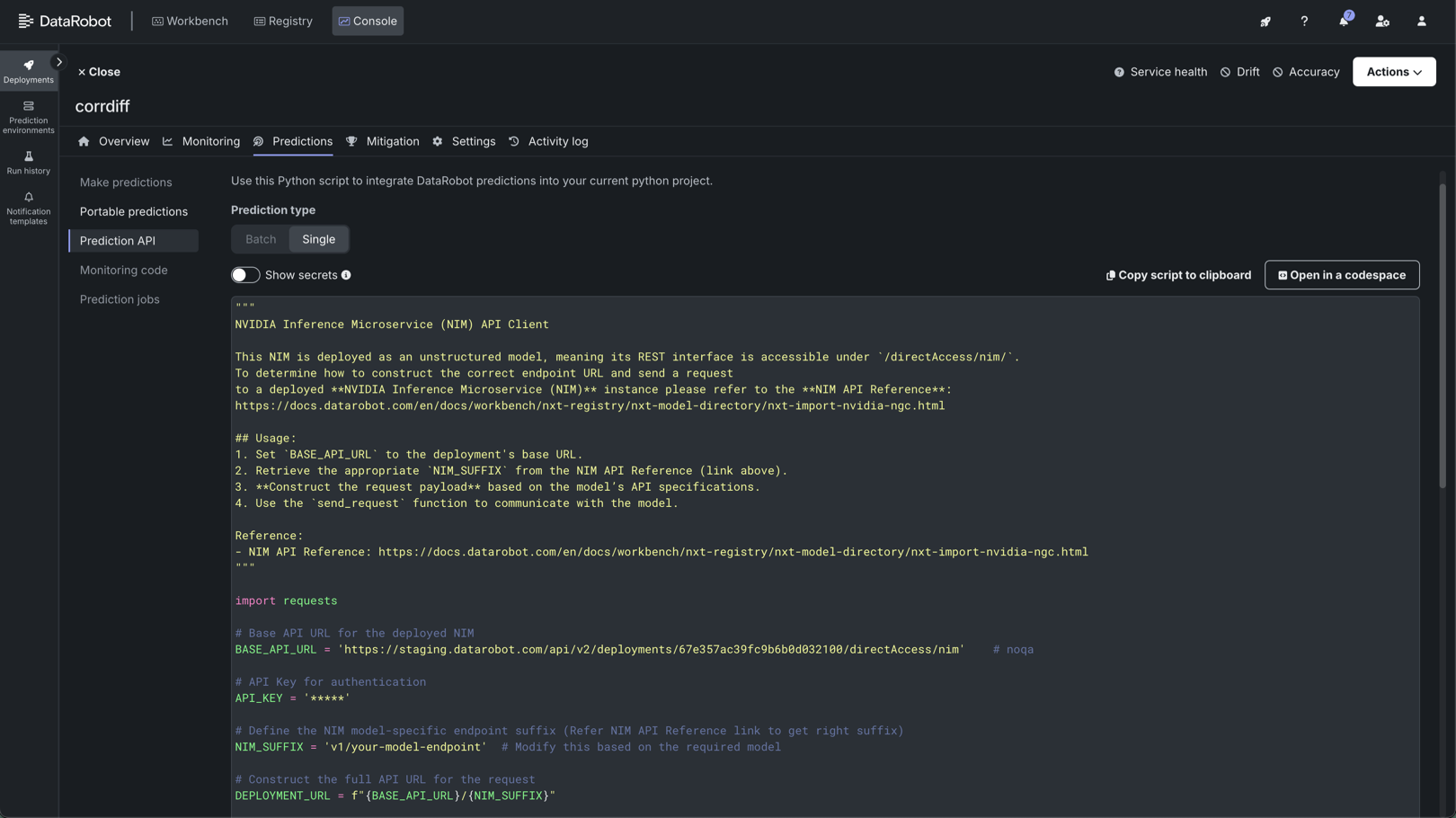 デプロイの予測 > 予測 APIタブで、予測APIのスクリプトコードにアクセスします。 テキスト生成モデルの場合、必要なエンドポイントのリンクは、DataRobotデプロイのベースURLです。 詳細については、ボルトオンのガバナンスAPIのドキュメントを参照してください。