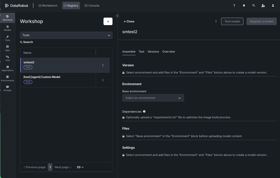 カスタムモデルのファイルコンテンツを組み立てると、DataRobotにアップロードする前に開発目的でローカルでコンテンツをテストできます。 ワークショップでカスタムモデルを作成した後、テストタブからテストスイートを実行できます。