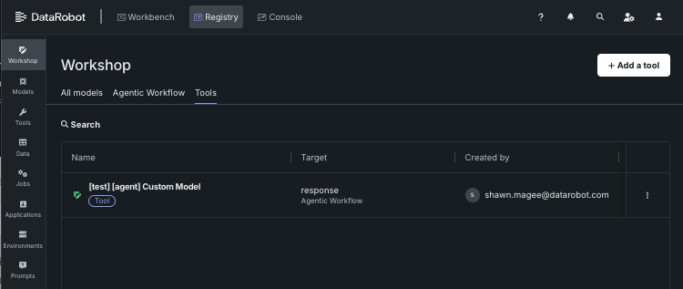 Agentic tools are registered in the Registry so that they can be easily listed and called by agents, granting them access to the DataRobot API. These tools can be viewed in the Tools tab of the Workshop.