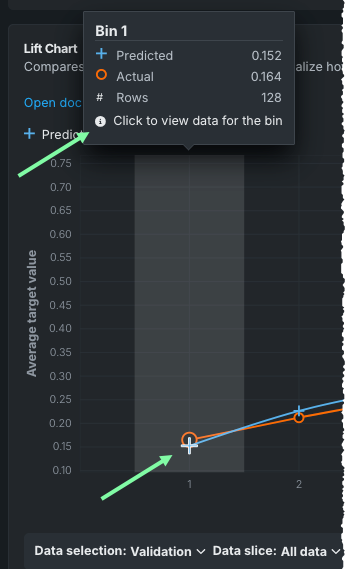 - 任意のポイントにカーソルを合わせると、そのビンの行の予測値スコアと実測値スコアが表示されます。