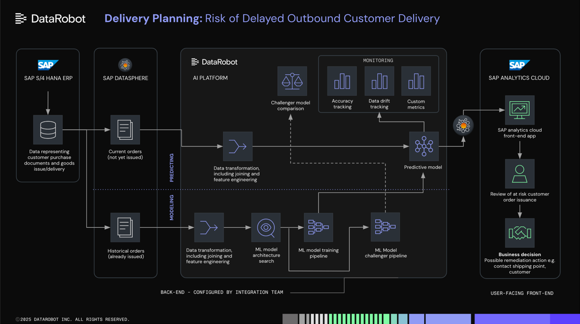 - Seamless SAP integration—Experience smooth data exchanges between SAP and DataRobot via the Datasphere connector, accessing source data and writing back predictive results. This closed loop allows you to continue using your current infrastructure while augmenting it with the advanced AI capabilities that DataRobot provides.
