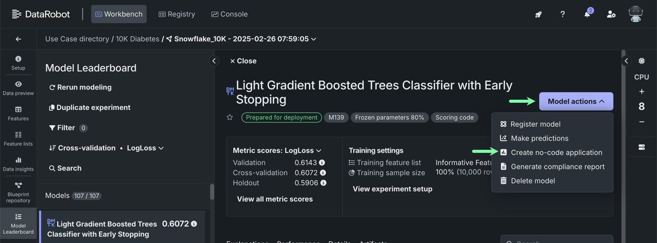 ワークベンチのエクスペリメント > モデルリーダーボード > モデルのアクション > ノーコードアプリを作成から実行できます。