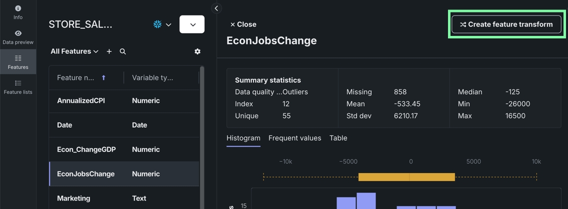 このセクションでは、ユーザー作成の手動による特徴量変換について説明します。 変換された特徴量によって元の特徴量が置換されることはありません。変換された特徴量は、モデル構築用の新しい追加特徴量として提供されます。