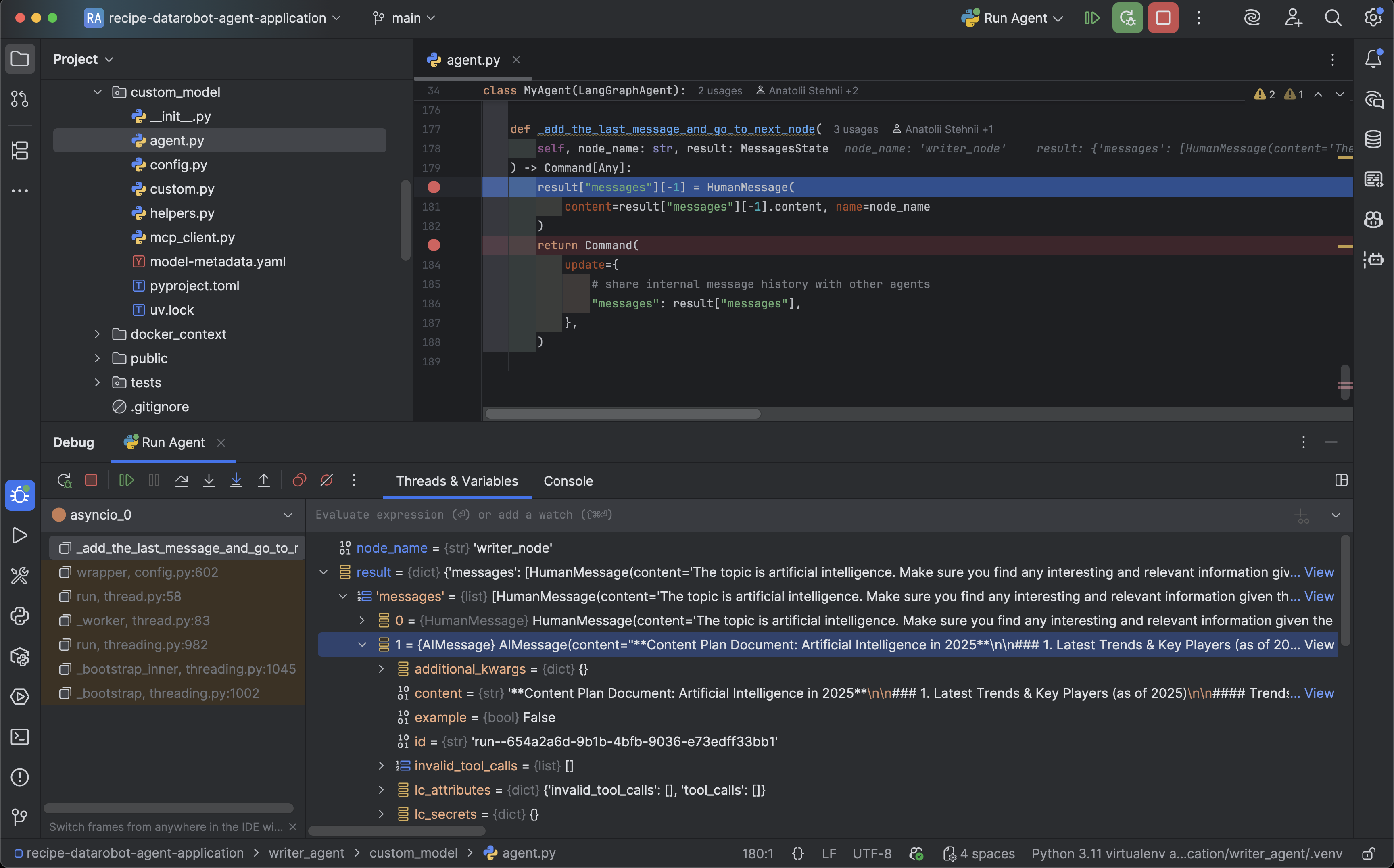 The Run Agent configuration launches the agent development server with your environment variables and interpreter already wired up.