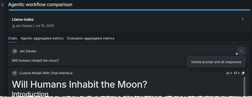 You can remove both the prompt and all responses from the chat history from within the Agentic workflow comparison window: