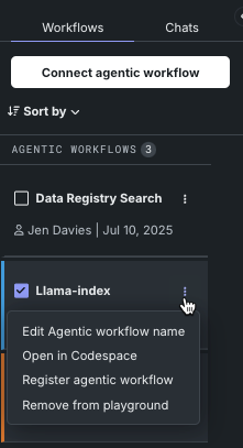 | Remove from playground | Delete the agentic workflow from the playground. Removing an agentic workflow deletes it from the Use Case but does not delete it from Workshop. All playground-related information stored with the workflow, including metrics and chats, are also removed. |