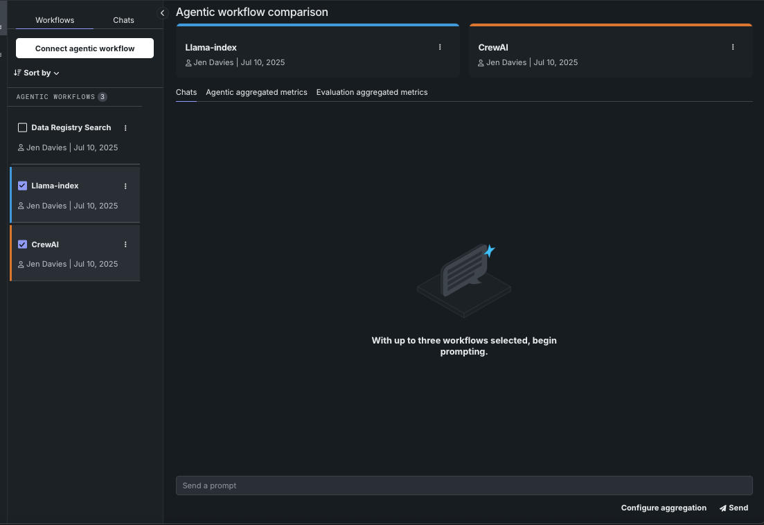Enter a prompt to start a chat for either single or multi-agent chatting from the Agentic playground > Workflows tab. Click Send to request a response.