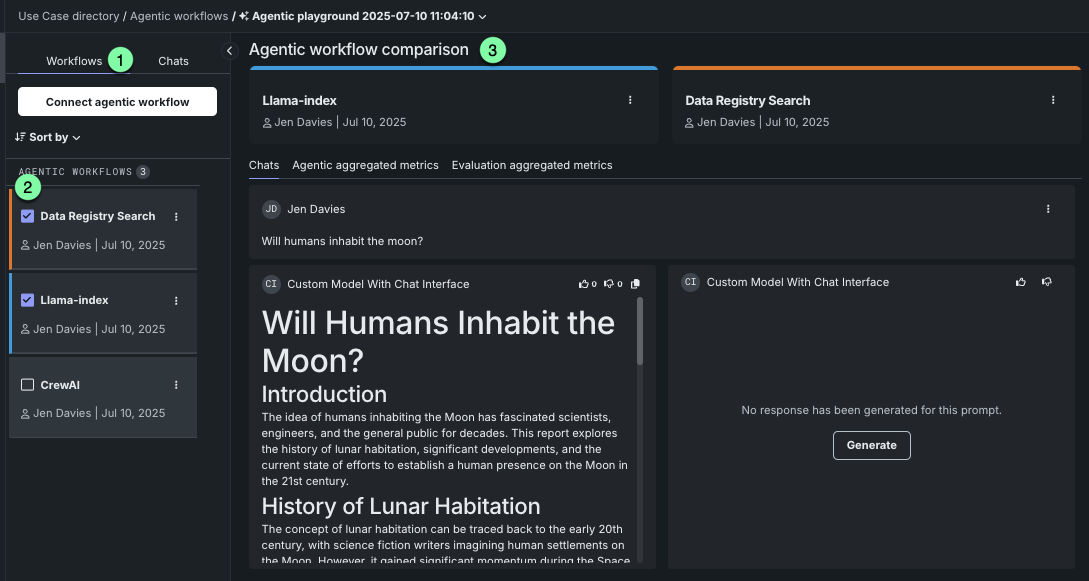 - Displays Agentic workflow comparison in the top of the chat window (3).