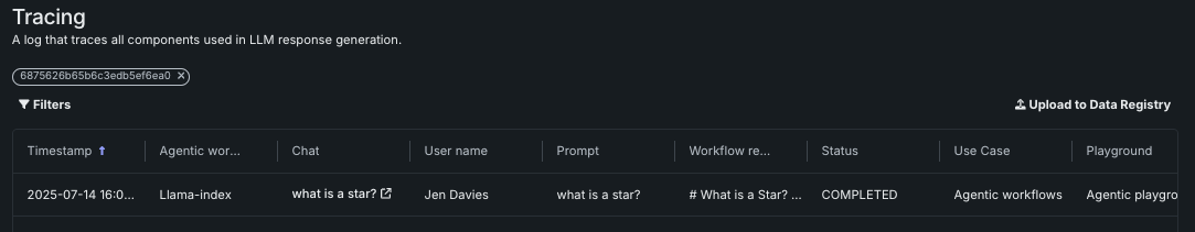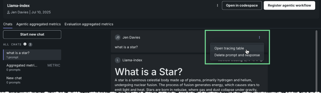 | Response header | Review tracing | Opens the tracing details panel, illustrating the path a single request takes through the agentic workflow. |