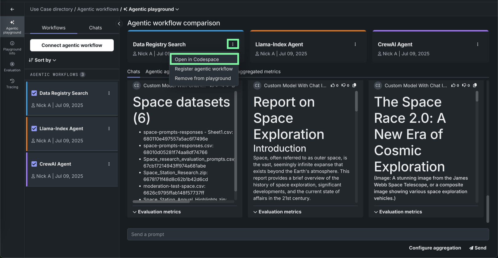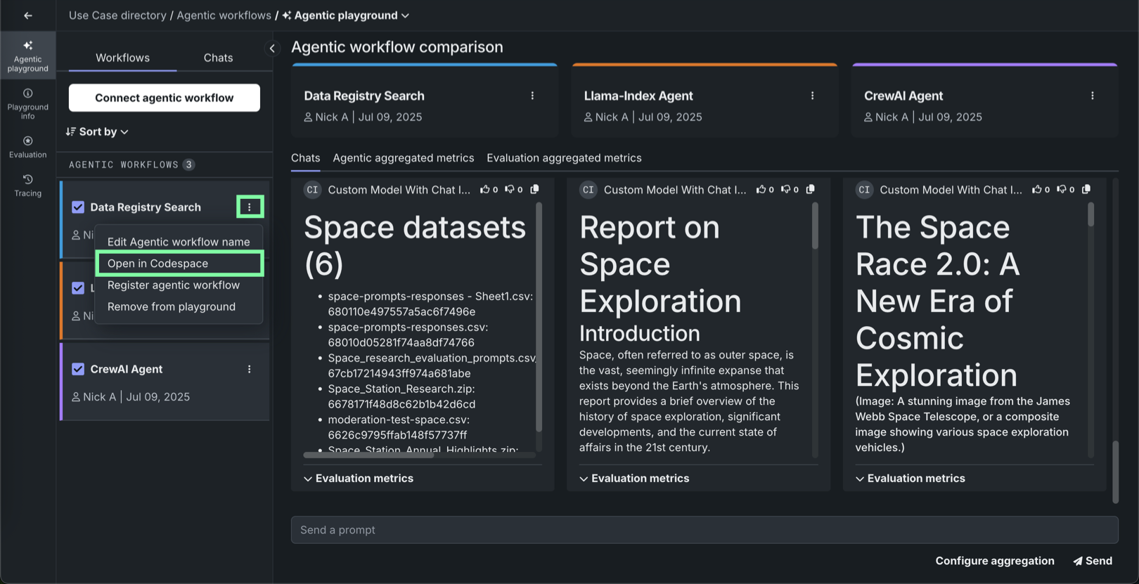 After you've connected an agentic workflow custom model to an agentic playground, as you compare and test the workflow, you can modify the workflow's code in a codespace or in the Registry workshop. Changes to the code are reflected in the agentic playground, allowing agentic workflow builders to experiment until they build a production-ready agentic workflow for deployment to Console.