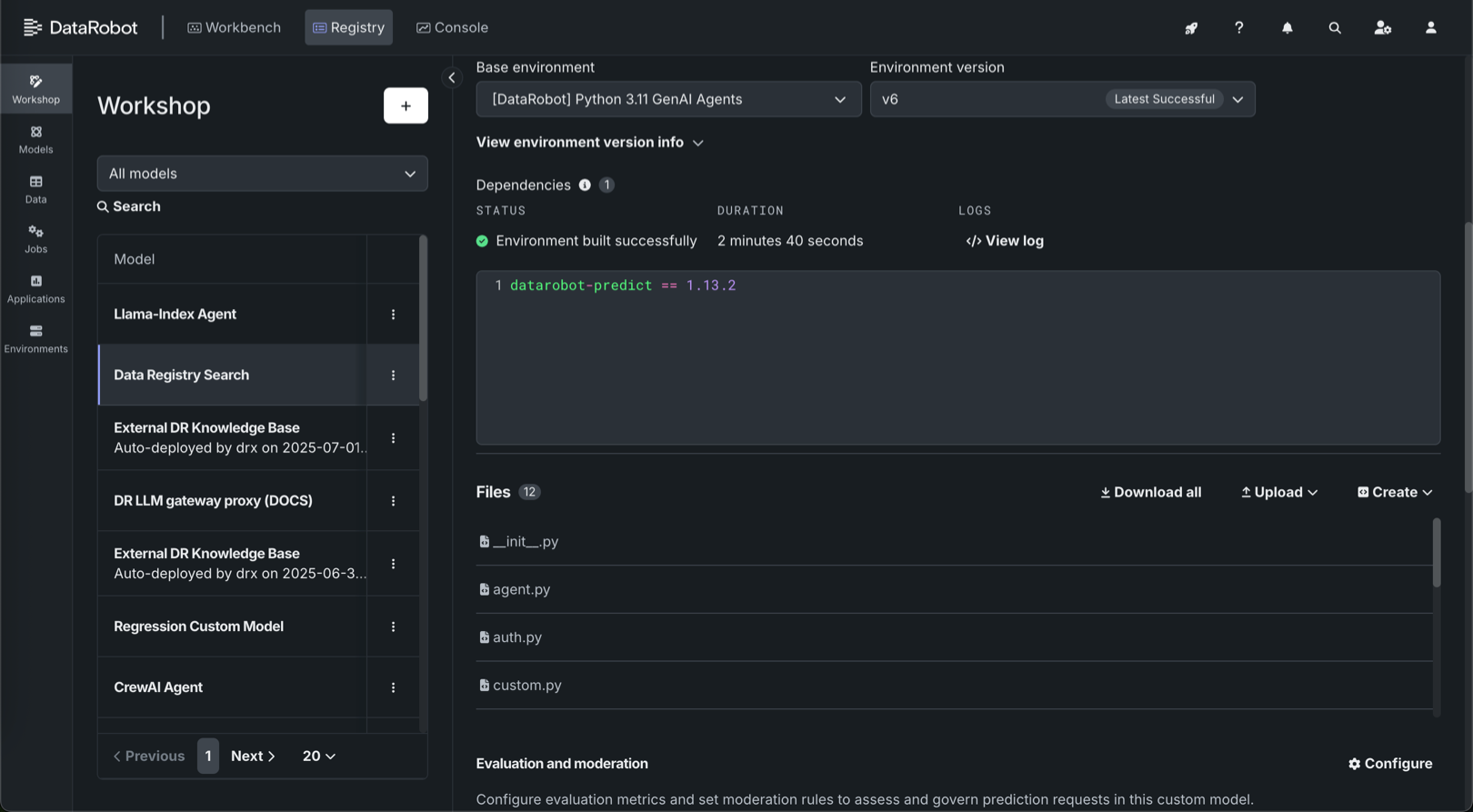 Tools, templates, and information for assembling, debugging, testing, and running your custom models, custom tasks and custom notebook environments with DataRobot. The custom model infrastructure is the foundation of agentic workflows. |