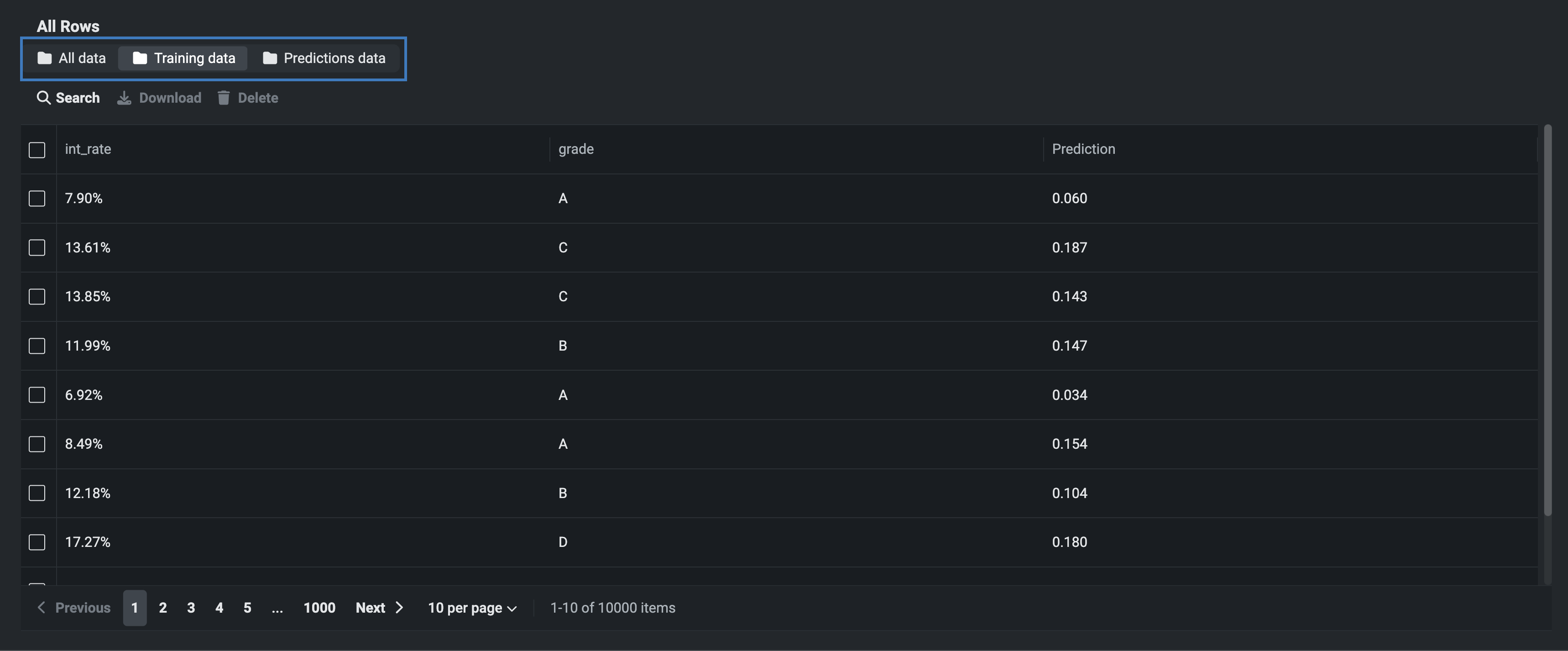 The All Rows widget populates using the training data as the prediction data source. Additionally, new tabs have been added so you can view training data, prediction data, or both.