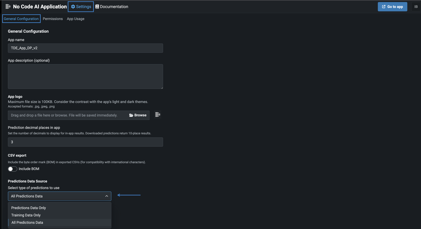 By default, the app uses only training data as the prediction data source. You can update the prediction data source in the app's settings.