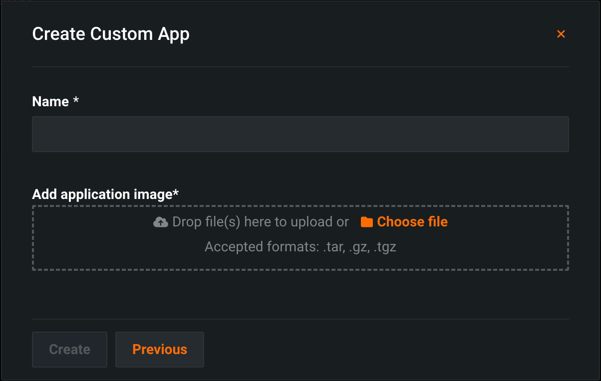 Once you have a custom application tar, gz, or tgz archive, you can upload the image to the Applications tab in DataRobot: