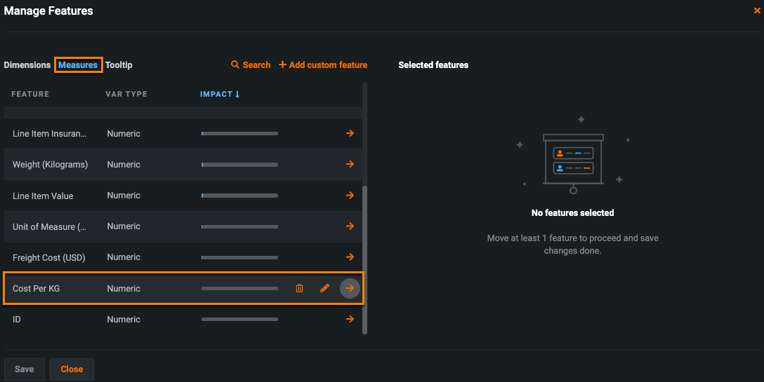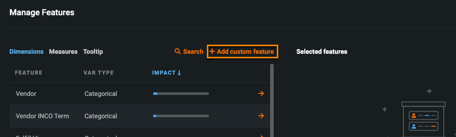 In the Dimensions tab, click the orange arrows next to one or more features you’d like to visualize on the x-axis. You can select categorical, date, and boolean features.