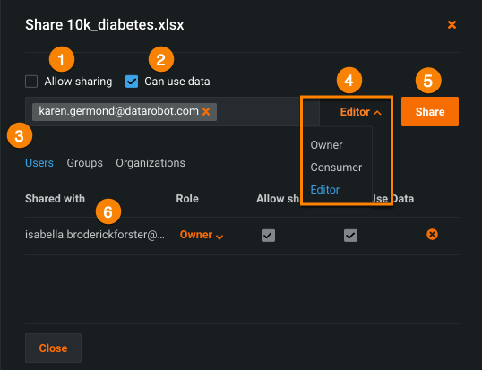 Assets in the AI Catalog can be shared to users, groups, and organizations.