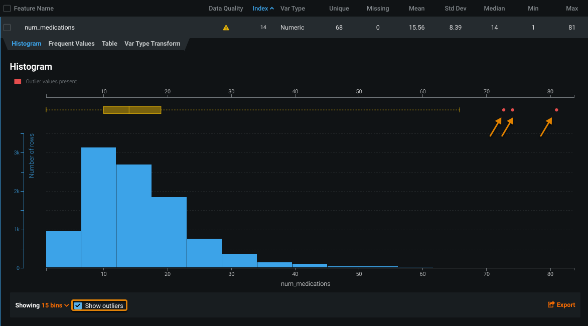 Use the Data Quality Assessment tool to locate features with outliers. If a feature has outliers, a warning icon (