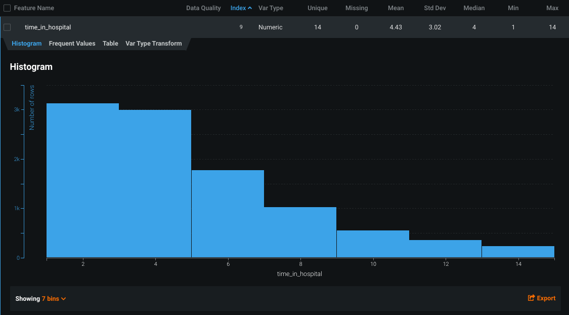 In the histogram, the orange circles indicate the average target value for a bin. In this example, hospital visits of 8 days result in the highest average target value— for 8-day visits, 46.12% of rows have readmitted = 1.