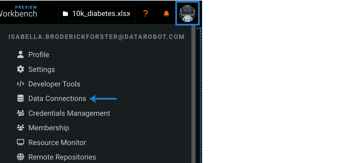 1. Click your user icon in the upper-right corner and select Data Connections.