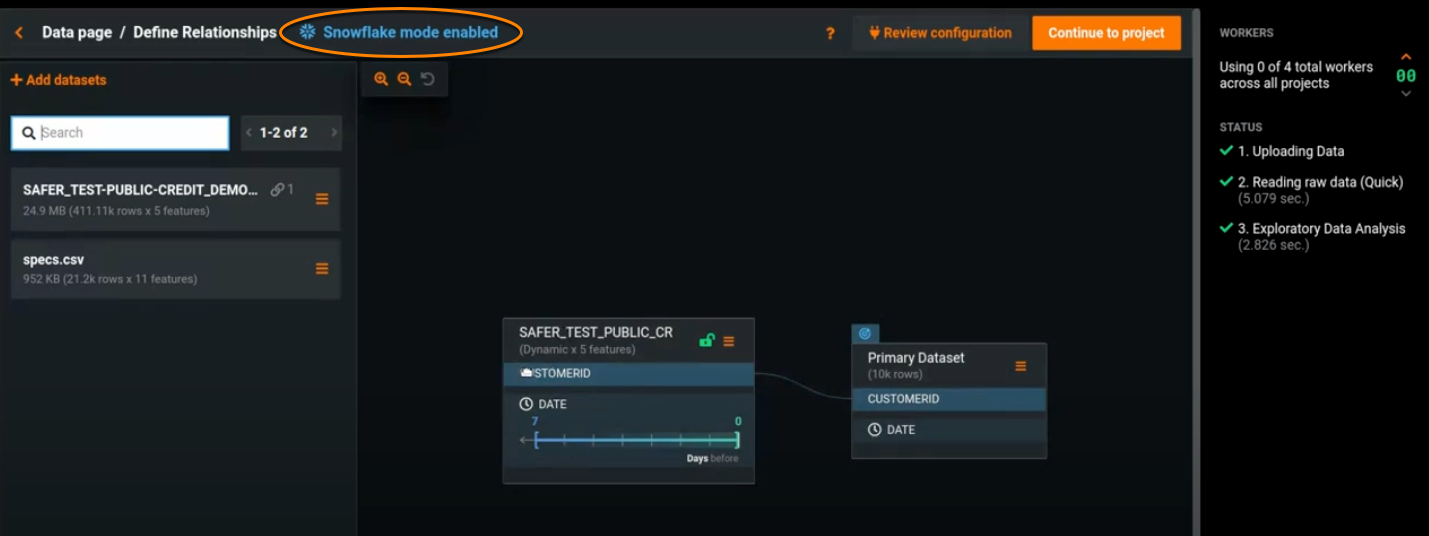 If the above requirements are met, DataRobot automatically establishes the integration and displays the Snowflake icon and Snowflake mode enabled, in blue, at the top of the Define Relationships page.