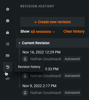Access additional actions for managing revisions by clicking the menu icon on the right of each entry. Note that you can update the names of manual revisions, while autosaved revisions will only have their timestamp as a name.