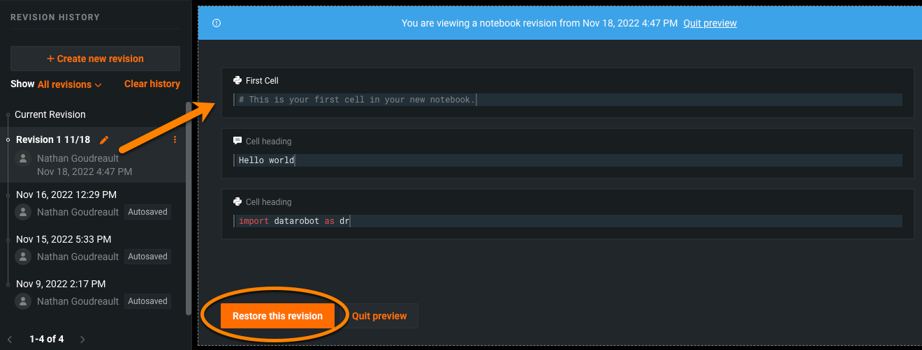 • Restore revision: Restore the current notebook to the state of the selected revision. After restoring to a given revision, saving will create new revisions at the top of the revision list.