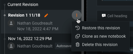 • Delete the revision: Permanently delete an entry from the notebook’s revision history.
