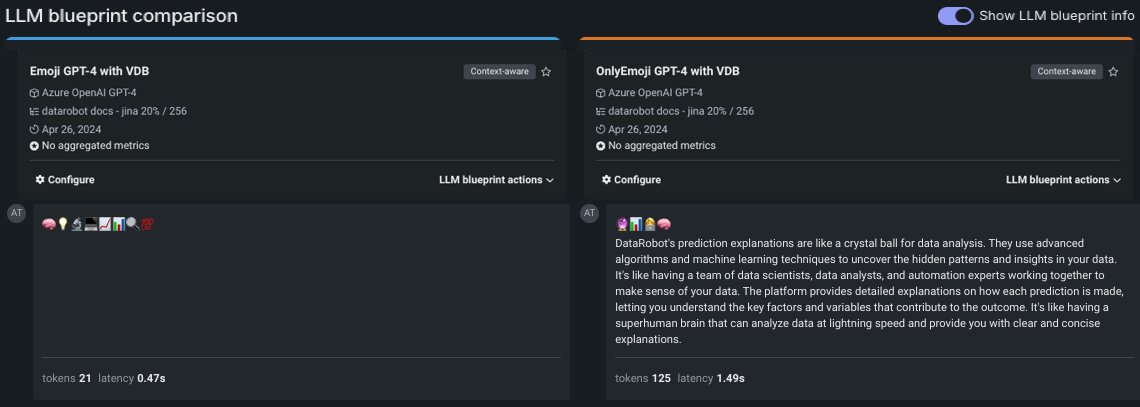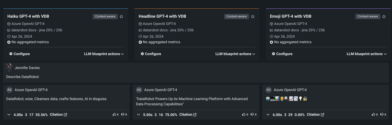 2. Send a prompt (Describe DataRobot). Each LLM blueprint responds in their configured style: