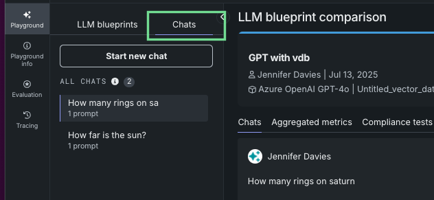 A comparison chat groups together one or more comparison prompts, often across multiple blueprints. Use the Chats tab to access any previous comparison prompts made from the playground or start a new chat. In this way, you can select up to three LLM blueprints, query them, and then swap out for other LLM blueprints to send the same prompts and compare results.