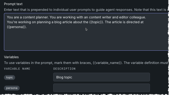 If you enter a variable in the Prompt text field, the Variables section expands to include a description field. The description is required; the content of this field displays on the individual prompt details page. It does not define the variable. Variable must be defined in the MyAgent class of the agents.py file.