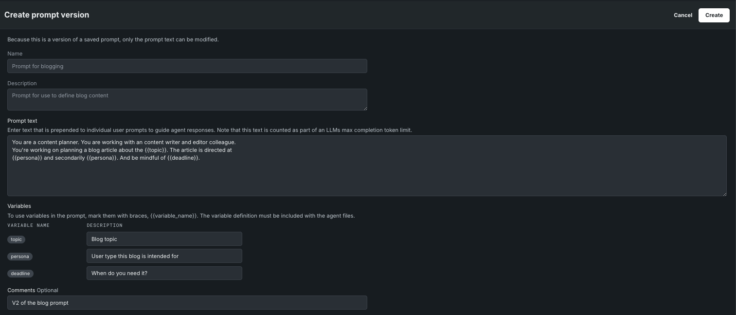 Click Create new version from current in the upper right to open the canvas for creating a new version of the prompt. The existing prompt text, variables, and comments area are now editable. The name and description are not.