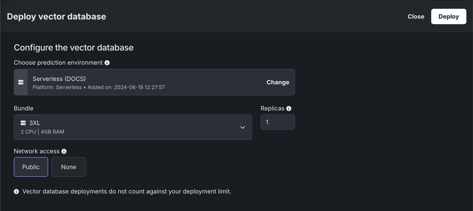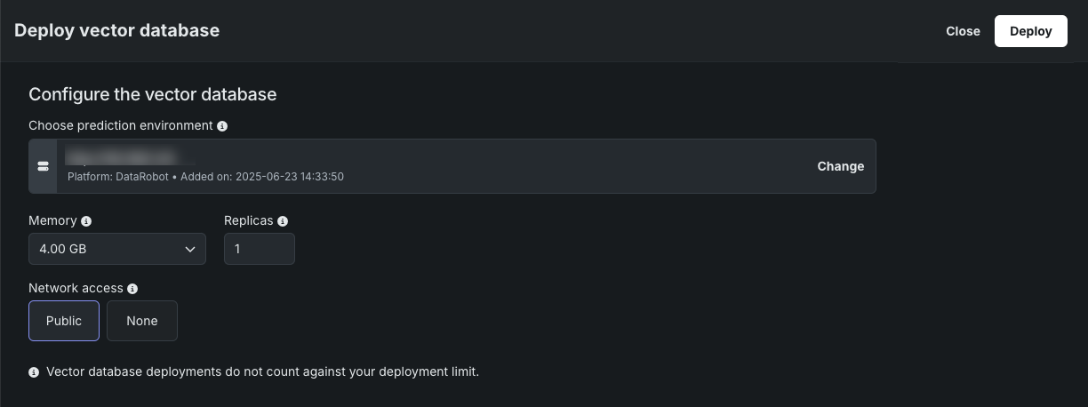 | Choose prediction environment | Determines the prediction environment for the deployed vector database. Verify that the correct prediction environment with Platform: DataRobot Serverless is selected. |