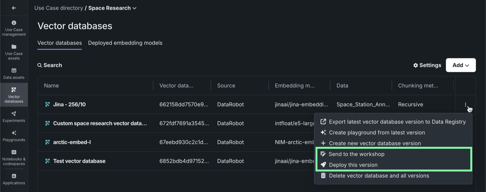 | Deploy this version (DataRobot-hosted) | Deploy the latest version of the vector database to the selected prediction environment. |