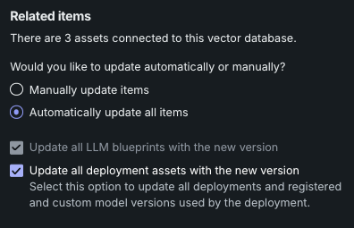 The help text under Related items indicates the number of assets related to source vector database that you are creating a new version from ("There are 3 assets connected to this vector database.") Use the radio buttons to set the update method for all assets connected to the source of the new version, either manually or automatically.