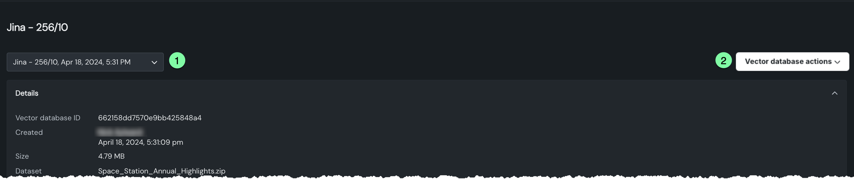 - Basic vector database metadata: ID, creator and creation date, data source name and size.