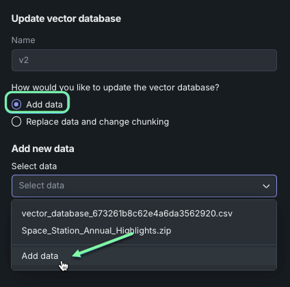 Choose how to update the vector database. You can either add data to the existing source data or replace the data source with entirely new data.