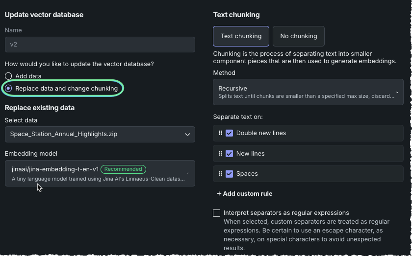 When replacing the data source entirely, both the embedding model and the chunking configuration can be changed. Fundamentally, this method rebuilds the vector database but provides you a starting point from an existing version. You may want to do this, for example, to test prompting strategies or to maintain deployed assets.