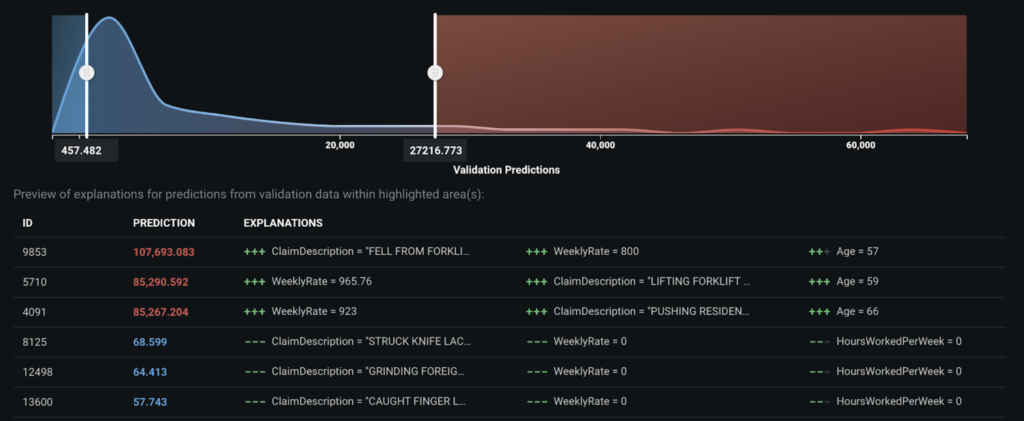 When a claims adjuster sees a low prediction for a claim, they are likely to initially ask what the drivers are behind such a low prediction. The Prediction Explanation insight, provided at an individual prediction level, can help claim adjusters understand how a prediction is made, increasing confidence in the model. By default, DataRobot provides the top three explanations for each prediction, but you can request up to 10 explanations. Model predictions and explanations can be downloaded as a CSV and you can control which predictions are populated in the CSV by specifying the thresholds for high and low predictions.