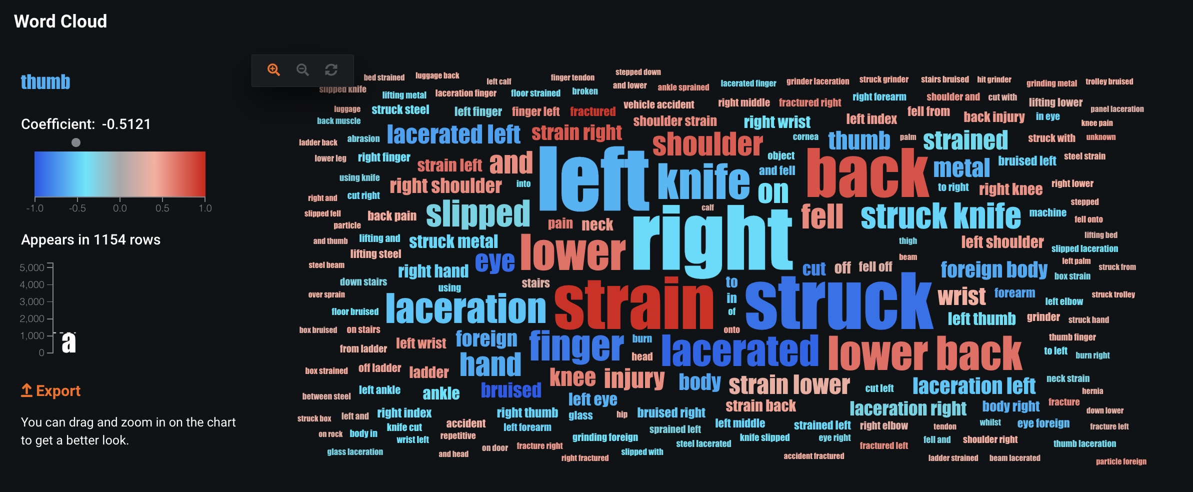 The feature ClaimDescription is an unstructured text field. DataRobot builds text mining models on textual features, and the output from those text-mining models is used as inputs into subsequent modeling processes. Below is a Word Cloud for ClaimDescription, which shows the keywords parsed out by DataRobot. Size of the word indicates how frequently the word appears in the data: strain appears very often in the data while fractureddoes not appear as often. Color indicates severity: both strain and fractured (red words) are associated with high severity claims while finger and eye (blue words) are associated with low severity claims.
