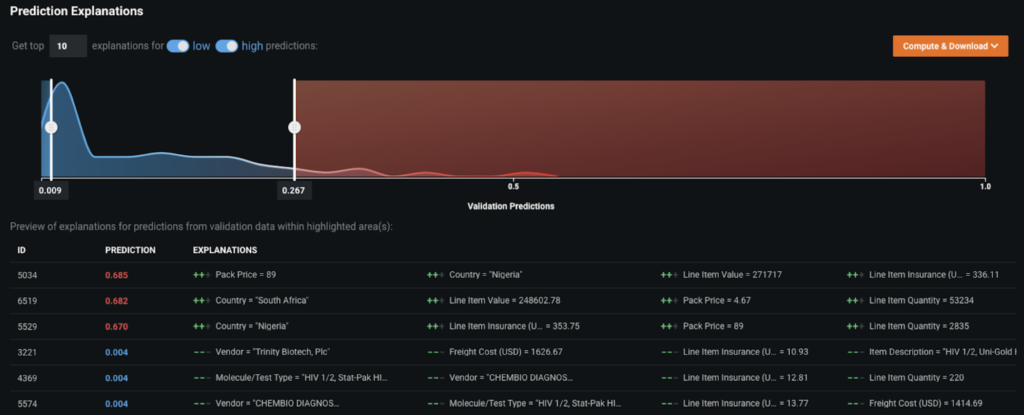 Once the model is deployed (in whatever way the organization decides), the predictions can be consumed in several ways. For example, a front-end application that acts as the supply chain’s reporting tool can be used to deliver new scoring data as an input to the model, which then returns predictions and Prediction Explanations in real-time for use in the decision process. For example, this No-Code AI App is an easily shareable, AI-powered application using a no-code interface: