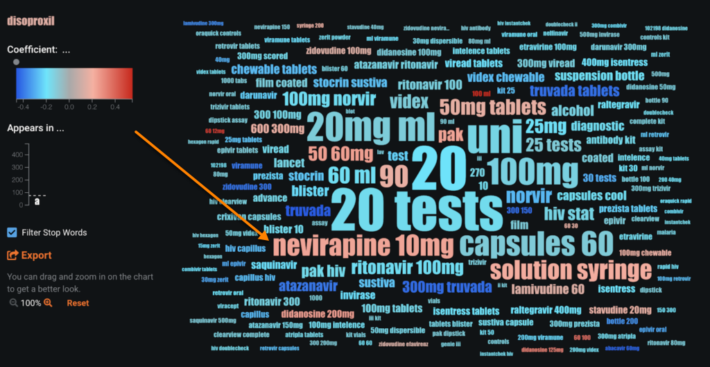For text variables, such as Part description in the included dataset, use Word Clouds to discover the words or phrases that are highly associated with delayed shipments. Although text features are generally the most challenging and time consuming to build models for, DataRobot automatically fits each individual text column as an individual classifier, which is directly preprocessed with natural language processing (NLP) techniques (tf-idf, n grams, etc.) In this cloud, you can see that the items described as nevirapine 10 mg are more likely to get delayed in comparison to other items.