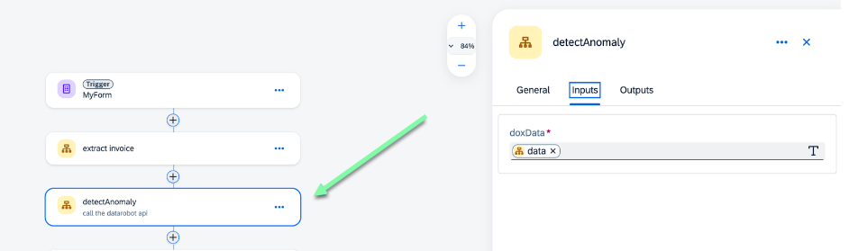 In the example process below, the “extract invoice” step parses a PDF invoice with defined elements in the “data” dataArray, and is given the variable name doxData. These are passed as inputs to the detectAnomaly process.