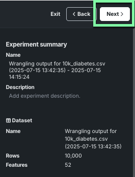 If the dataset needs further modification, you can choose to keep wrangling. Otherwise, from the new output dataset, click Data actions > Start modeling to set up a new experiment.