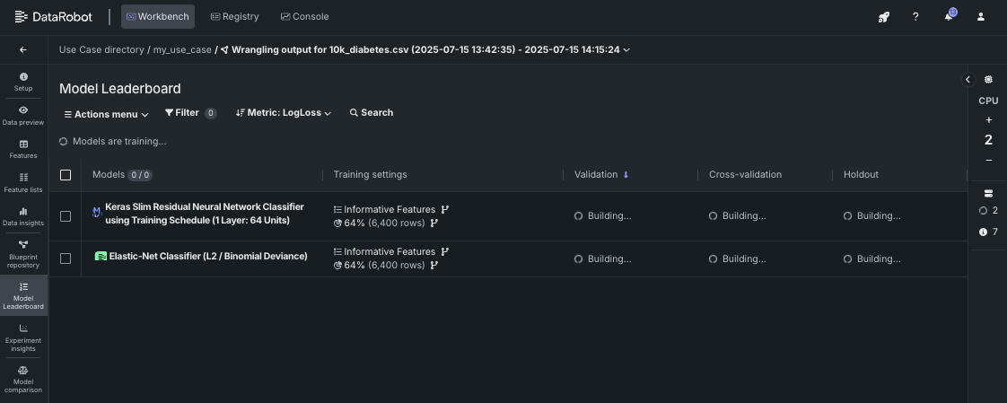 Once modeling begins, Workbench begins to construct a model Leaderboard.