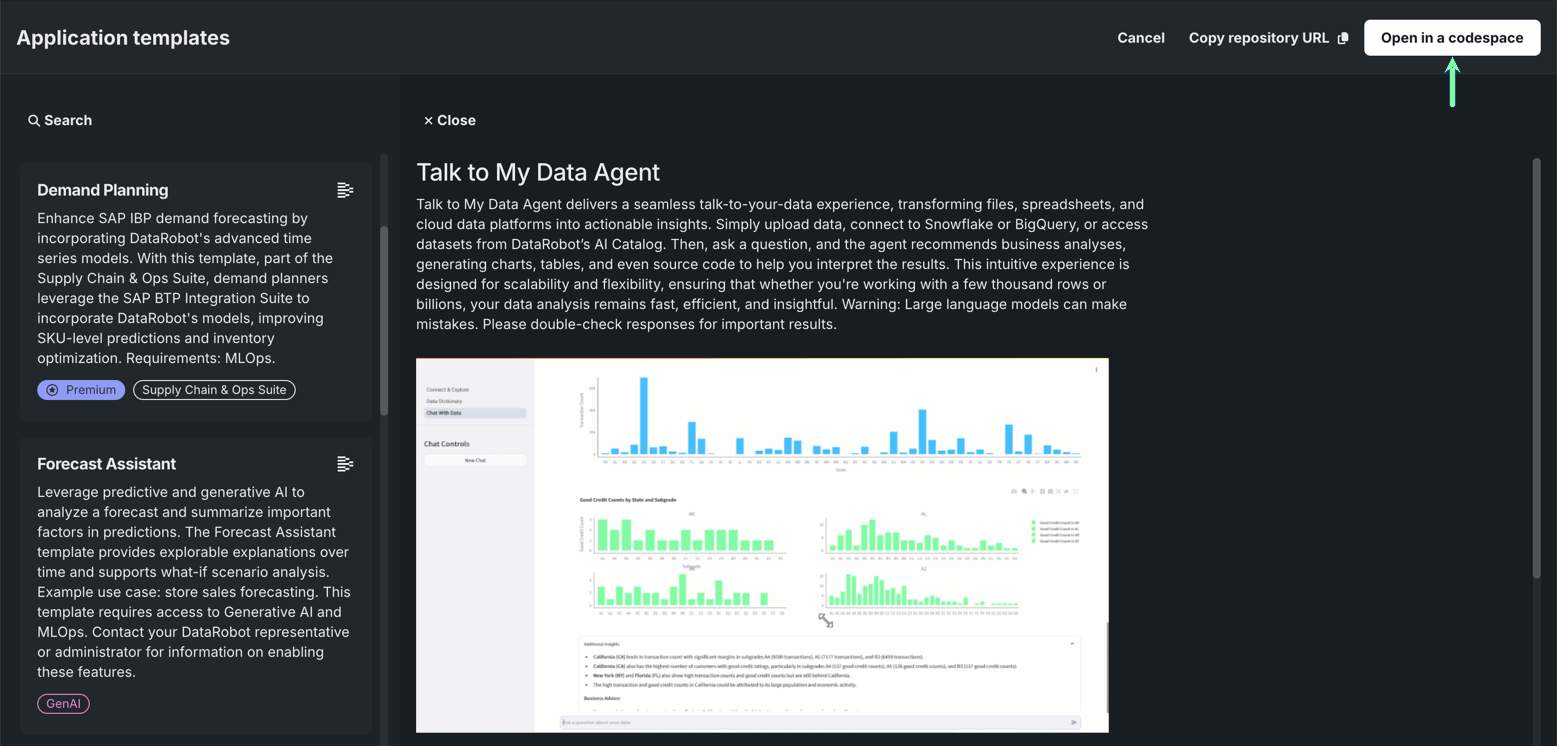 - Launch and the Talk to my Data Agent template in a codespace.