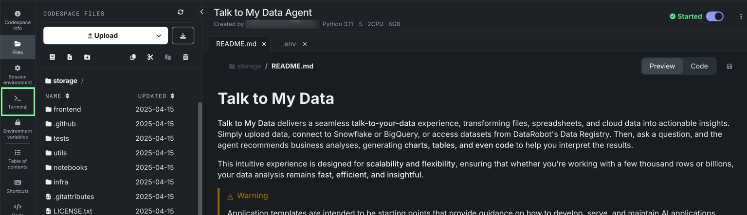 DataRobot opens and begins initializing a codespace. Once the session starts, the template files appear on the left and the README opens in the center. To learn more about the codespace interface, see Codespace sessions.