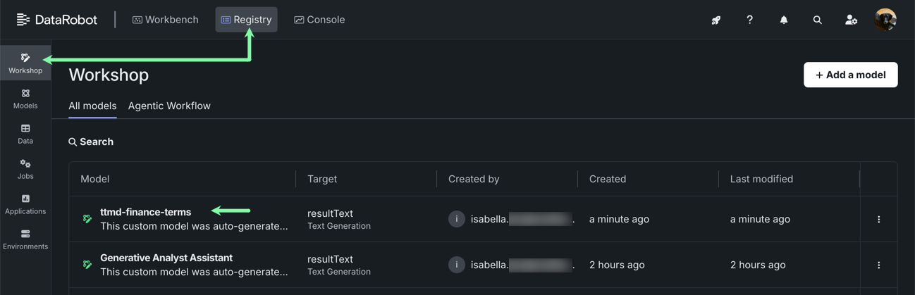 To register the RAG model, open Registry and select the Workshop tile. Select the model you sent over from the playground (ttmd-finance-terms).