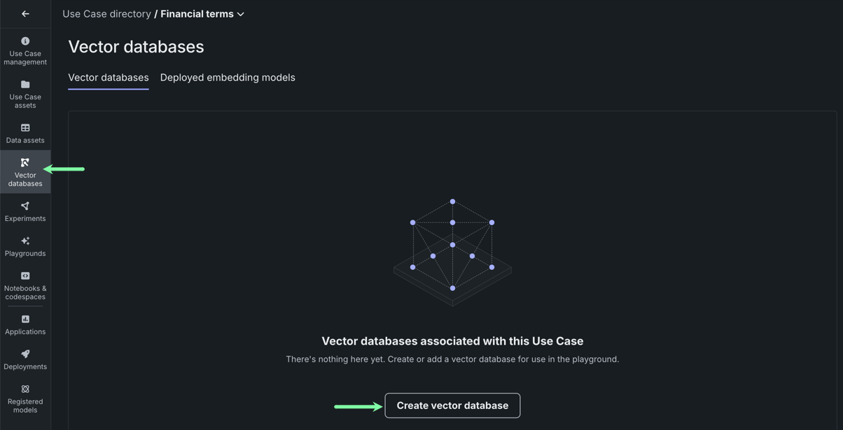Once the dataset is finished registering, in the left-hand navigation, click the Vector databases tile and then Create vector database.